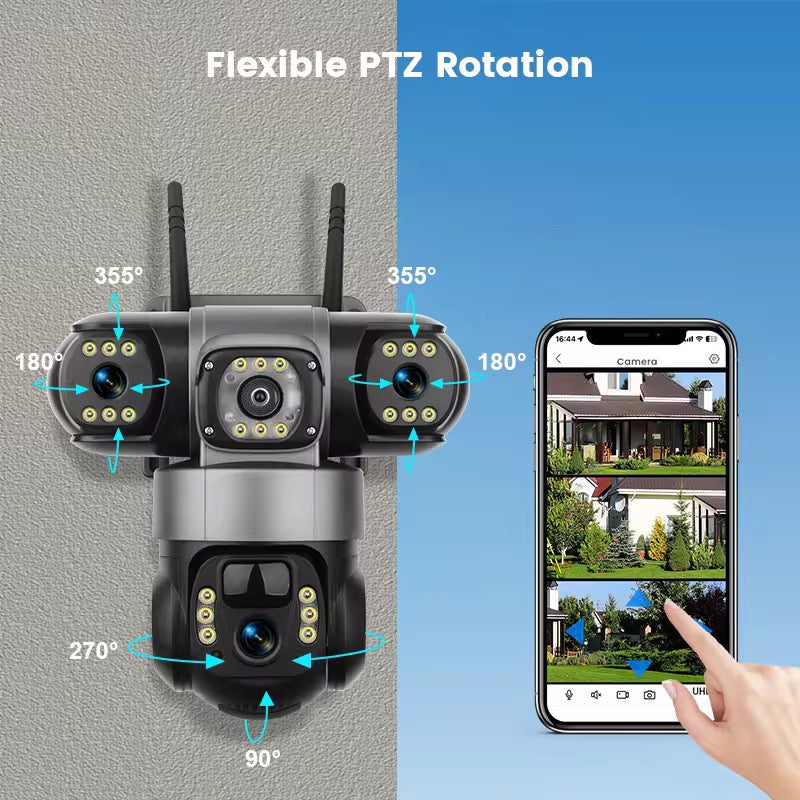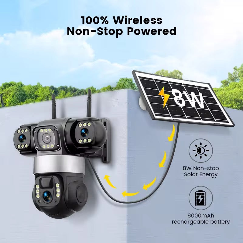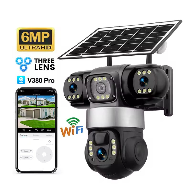 Skydda hem, stuga eller företag med denna 6MP solcellsdrivna PTZ-kamera. Med tre linser får du bred täckning och kristallklara bilder både dag och natt. Tack vare färgad infraröd nattvision ser du tydligt även i mörker.