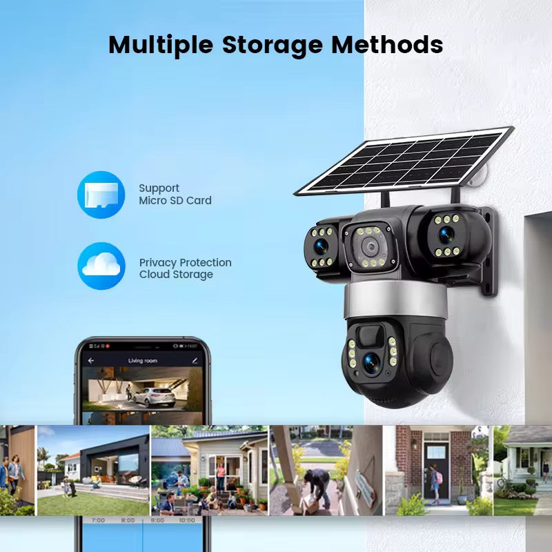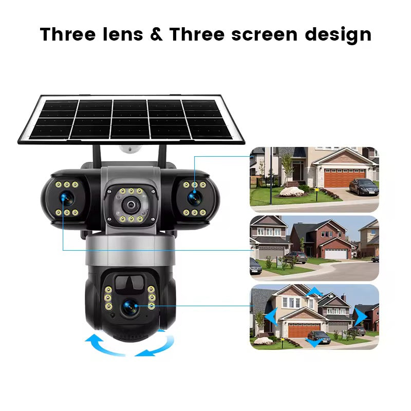 Solcellsdriven Övervakningskamera 6MP – PTZ kamera med tre linser, färg-nattvision & rörelsedetektering